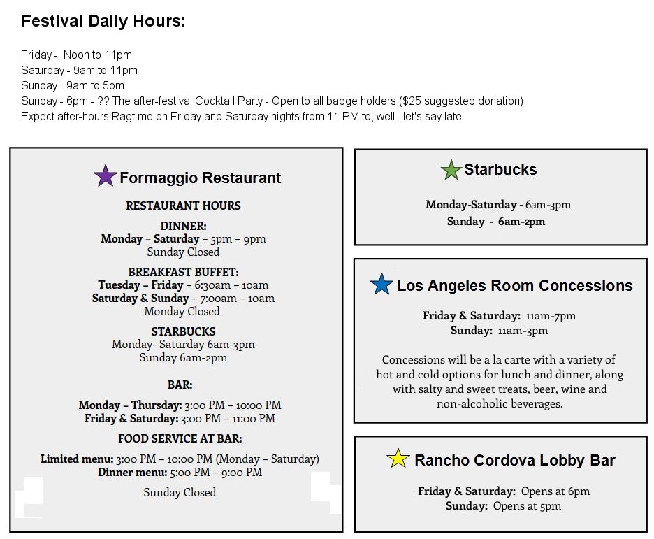 There will be three venues all on the ground floor level of the hotel, which run simultaneously, almost nonstop throughout the three days of the festival, including dancing. They do close for short periods on a rotating schedule for piano tuning and room setup. In addition, there are ragtime stores where you can purchase our performers' music, as well as various goodies like vintage clothing, records and more.